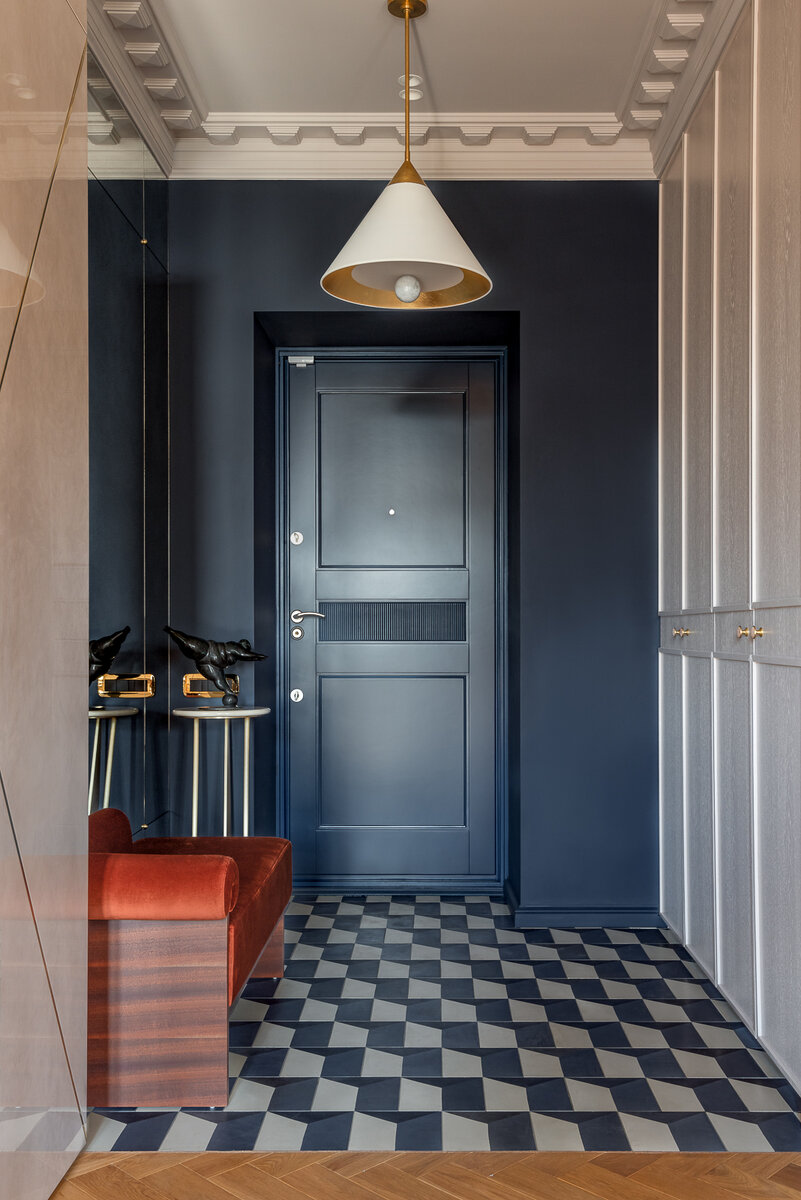 Яркая дверь перетягивает внимание на себя и отвлекает от недостатков помещения: