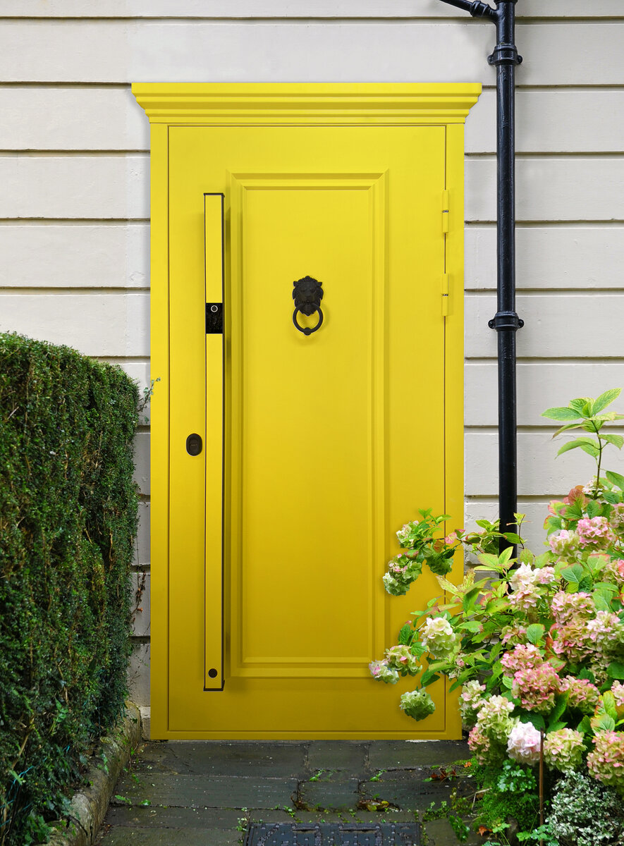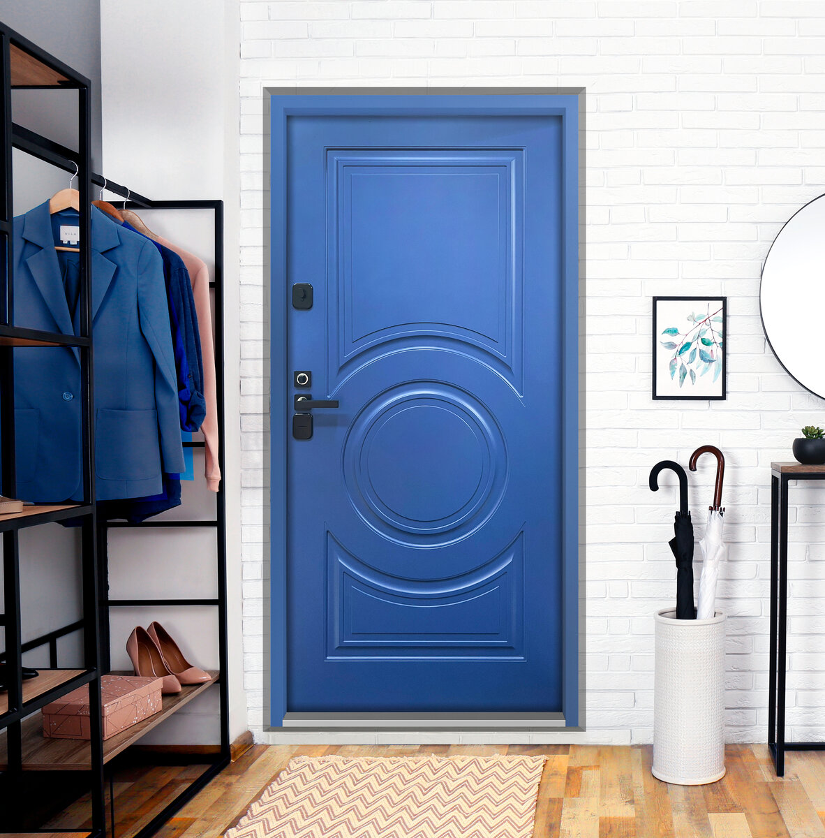 Такое решение можно реализовать и в прихожей, установив цветную входную дверь. Полотно, короб и вся фурнитура такой двери будет выкрашена на производстве в один цвет.