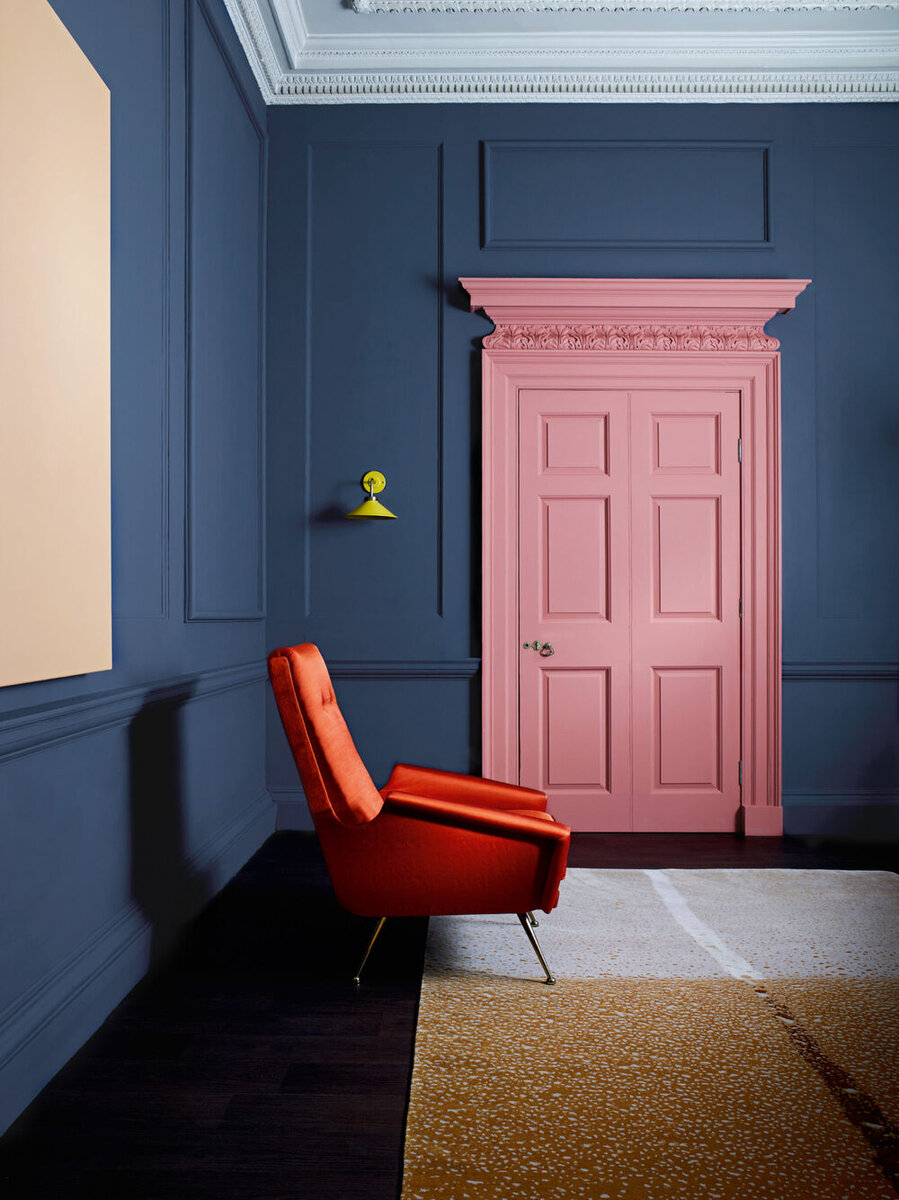 Яркая дверь сыграет на контрасте или составит интересный ансамбль с выразительной отделкой.