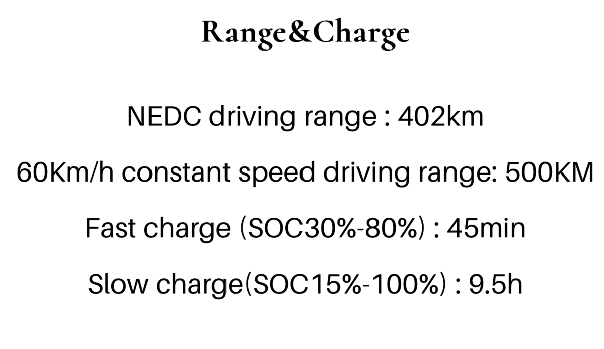 Если ориентироваться на данные сайта китайского производителя, то запаса хода хватит на 402 км. Правда это по циклу NEDC, а это значит, что можно село делить этот пробег на два.