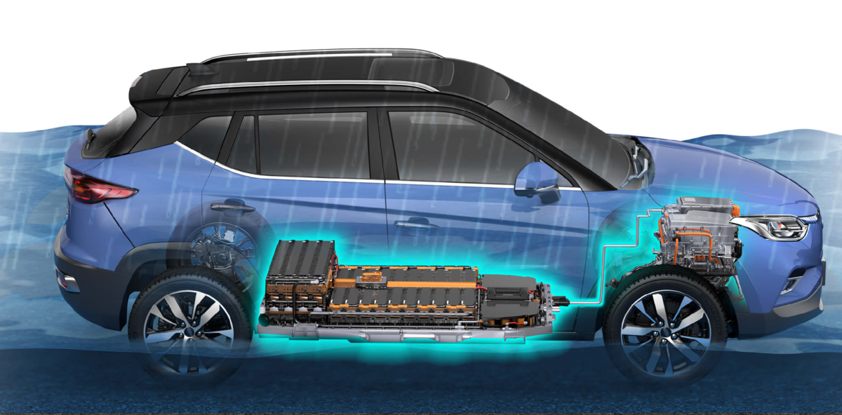 Будет и третий вариант машины, он получил имя "Москвич 3е". Как вы понимаете речь идет об "электричке". И это уже продающийся в Поднебесной JAC iEVs4. Как показано на рисунке батарея расположена под полом и задним рядом сидений(ее емкость 187 Ач), мотор приводит в движение передние колеса(Он честно говоря совсем слабенький и развивает всего 68 лошадок). Причем как утверждают сами китайцы, вся электросистема, батареи и мотор, не боятся воды.