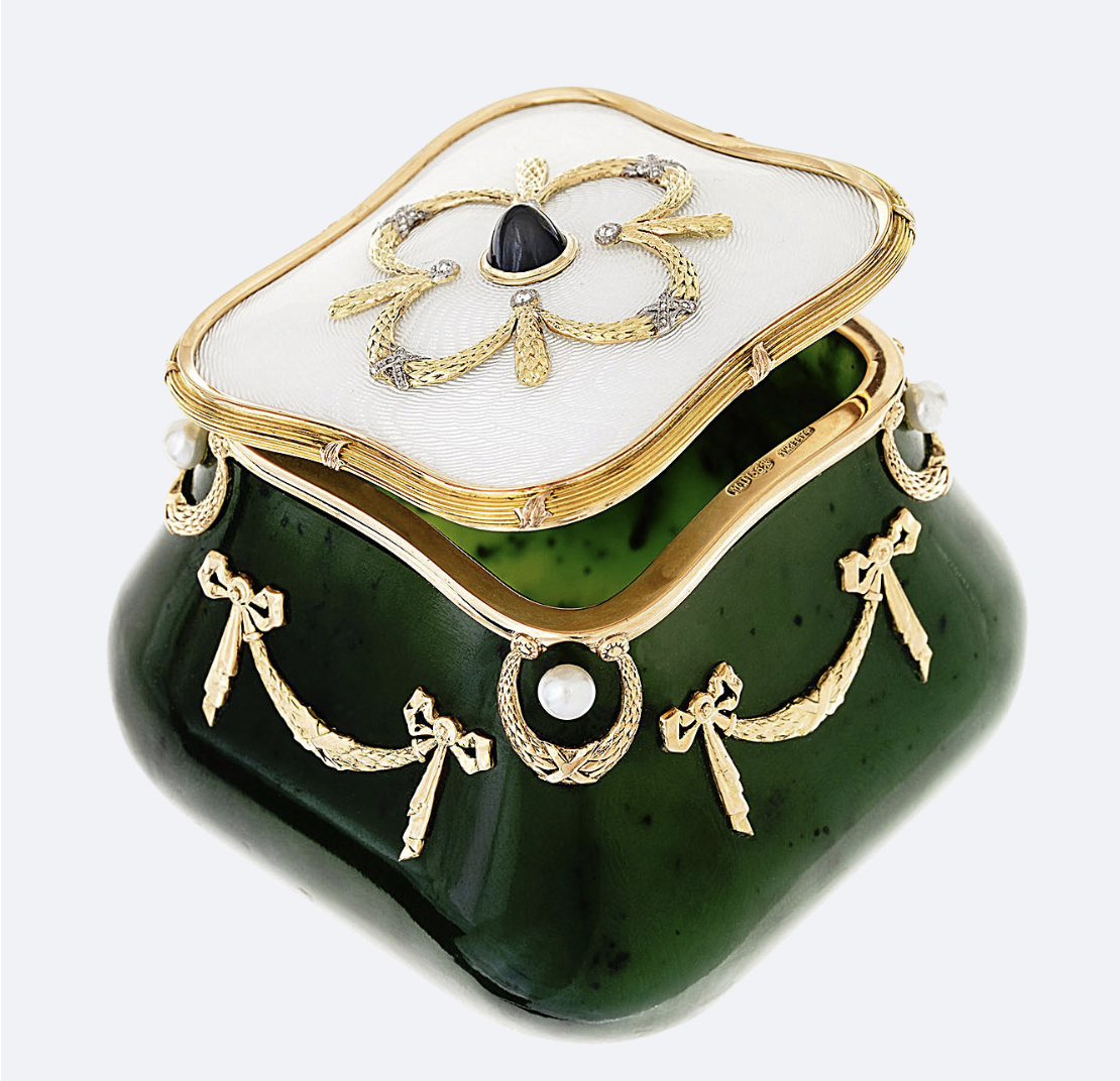 [COLOR=var(--zenColorTextAndIconsPrimaryLow)]Однажды Андрей Георгиевич приобрел несколько остатков от шкатулки Фаберже. Мастер восстановил работу, и теперь у шкатулки два клейма - Фаберже и Ананова. В этой шкатулке соединился талант двух гениев. Нефрит, жемчуг, сапфир, бриллианты, золото, гильошированная эмаль.[/COLOR]