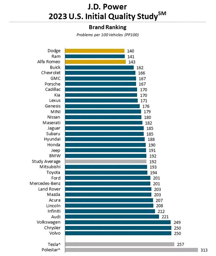 Если рассматривать конкретные марки автомобилей, то лидером в рейтинге JD Power стал американский бренд Dodge со 140 проблемами на 100 автомобилей. На втором и третьем местах расположились Ram (141 PP100) и Alfa Romeo (143 PP100). У Mersedes-Benz, к примеру, зафиксирована 201 проблема на 100 машин, а у новаторских Tesla и Polestar — 257 и 313 соответственно.