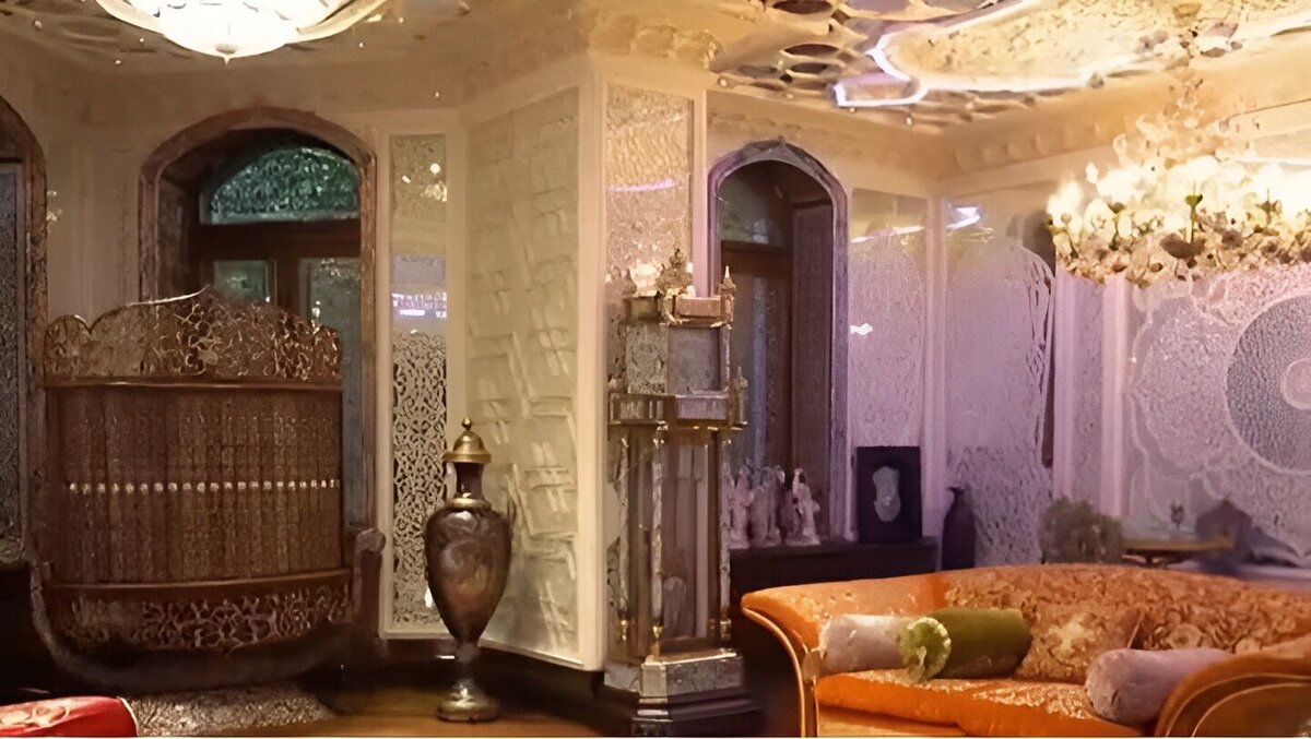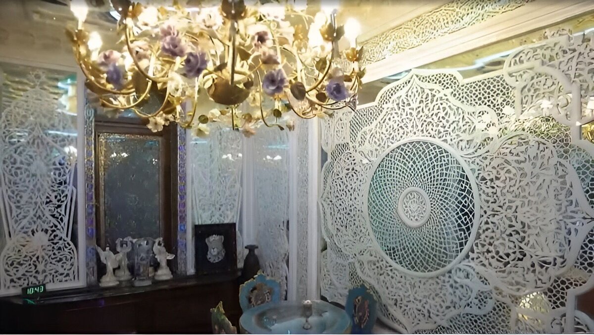 Интерьеры комнат поражают разнообразием: здесь и изысканные дворцовые палаты из мраморного кружева, и русская бревенчатая изба, и яркие восточные мотивы. В декоре стен использованы элементы традиционных русских узоров, современного европейского дизайна и узбекских мозаик.