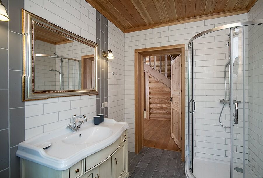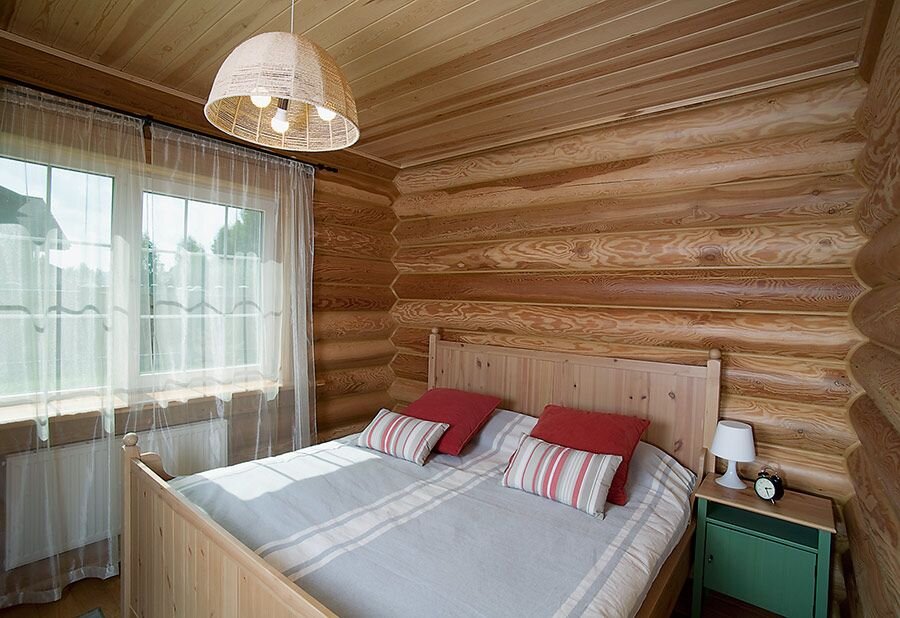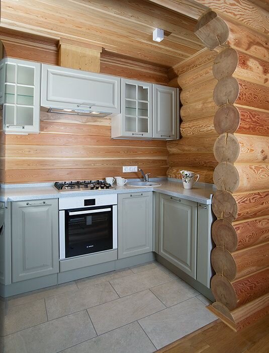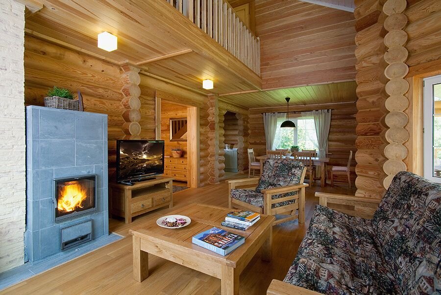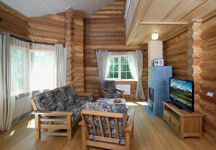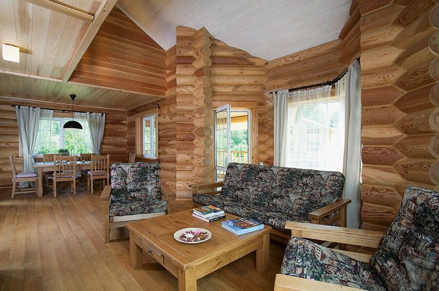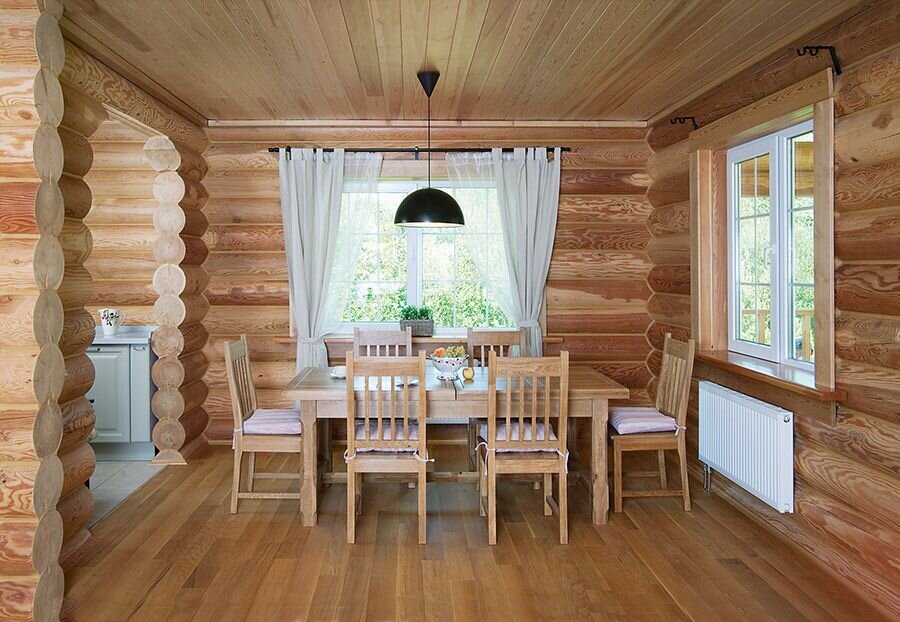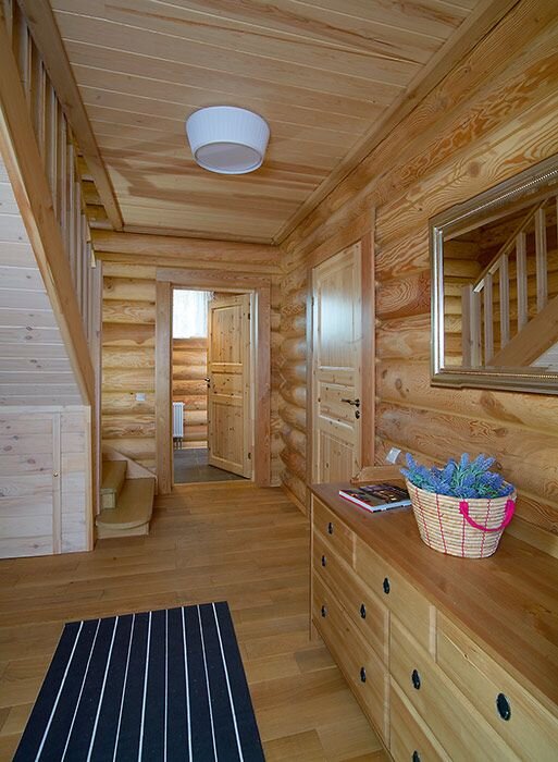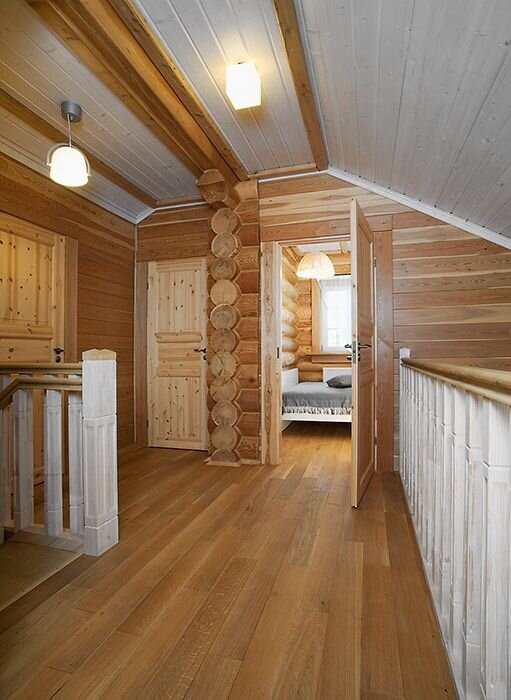 Внутренняя отделка бревна минимальна, потолок подшит ангарской сосной, пол во всех помещениях из массива дерева (кроме кухни и санузлов). Проблема натурального цвета дерева - поглощение естественного света, в таких домах складывается ощущение, мрачности помещения. Но эта проблема решаема большим количеством потолочных светильников.