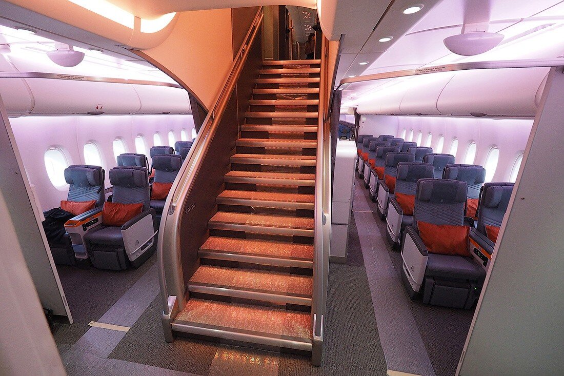 Верхняя и нижняя палуба соединяются двумя лестницами в носовой и хвостовой частях самолёта. Общая площадь салона составляет 554 квадратных метра.
