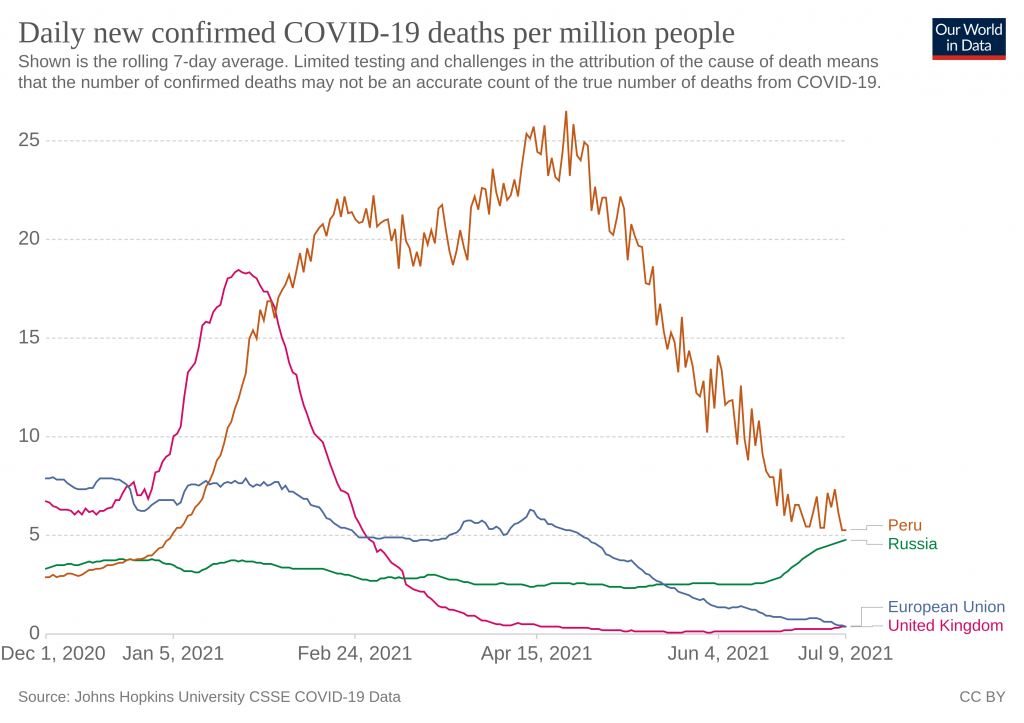 Может быть, у жителей Манауса, как и у русских тоже плохой иммунитет, и это еще одно исключение? Допустим — и возьмем другой пример. Перу, страна с 32 миллионами населения, где от ковида умерло 0,6% жителей. Это автоматически означает, что переболели там не менее 60%. Как мы видели выше на примерах ЕС и Великобритании, при 60% людей с вакцинным иммунитетом массовых смертей от эпидемии быть не может. Случилось ли так в Перу?