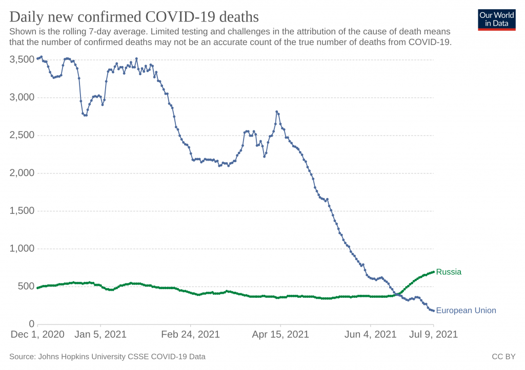 https://webpulse.imgsmail.ru/imgprev...99099&mb=pulse По числу вновь заболевших в сутки англичане серьезно обгоняют нас, а если считать на душу населения, то превосходят в разы / ©OurWorldInData А вот по смертности все совсем иначе. В России в сутки от ковида умирает 693 человек, а в Великобритании — только 25. Разница — 28 раз. Для 11 июля 2021 года ковид в России оканчивается смертью (в пересчете на душу населения) в 13,3 раза чаще, чем в Британии. Реальность, вероятнее всего, еще хуже: по опыту прошлых месяцев, данные смертности от российского Оперштаба занижены примерно в пять раз. То есть реальный разрыв с Англией может быть до 60 раз и более. (Впрочем, нельзя исключить и того варианта, что правдивость данных Оперштаба в последние месяцы несколько выросла: так это или нет, будет понятно только после публикаций данных Росстата по смертности в июне-июле 2021 года).