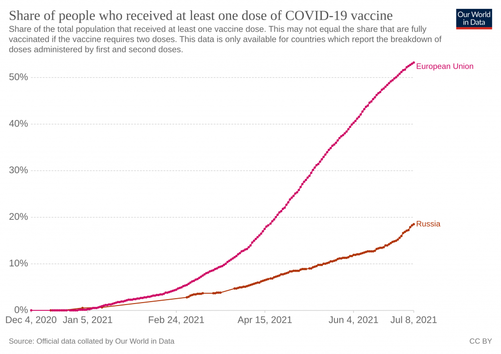 Когда иммунитет от ковида есть у 50% населения, никакой острой коронавирусной эпидемии в стране быть не может. Возьмем ЕС: там привито как раз чуть более 50% населения. В сутки там умирает 183 человека, а у нас — 693. Однако в ЕС проживает в разы больше людей, чем в России. Поэтому на миллион жителей в ЕС от ковида ежесуточно умирает 0,43 человека, а в России — 4,71, или в 11 раз больше.