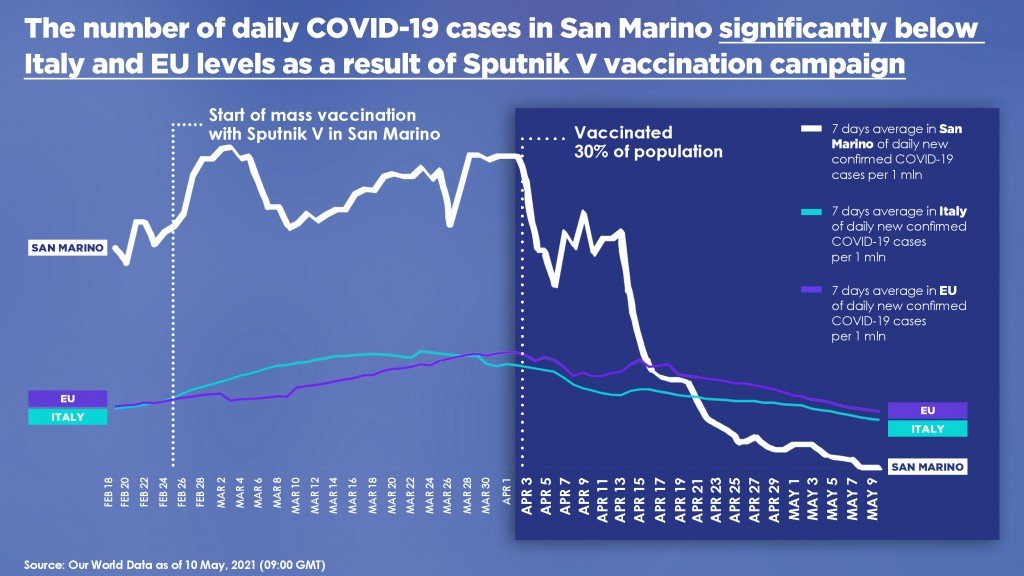 https://webpulse.imgsmail.ru/imgprev...86477&mb=pulse Пример Сан-Марино показывает: как только вакцинировано хотя бы 30% населения, эпидемия идет на убыль. К 4 мая вакцинировано было три четверти сан-маринцев, на чем эпидемия там упала до нуля случаев в день, а ковидный госпиталь закрыли. Это микрогосударство доказало, что сочетание российской вакцины и образованного населения способно надежно остановить коронавирус. К сожалению, в России подобное вряд ли достижимо / ©sputnikvaccine.com https://rs.mail.ru/e84214088.gif?e=2