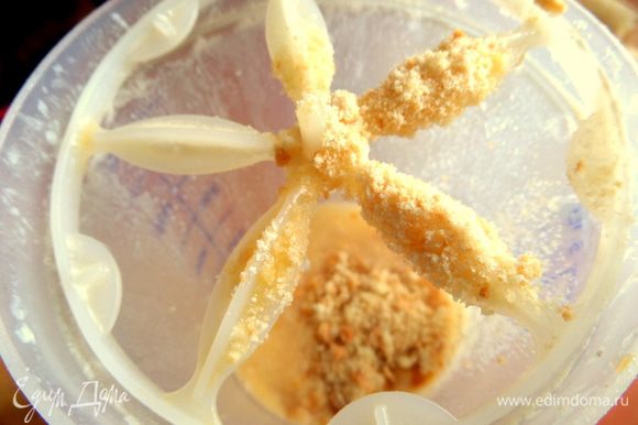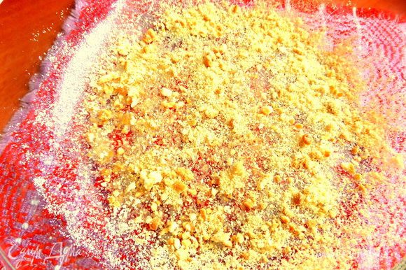 Дно формы для СВЧ смазать растительным маслом без запаха и посыпать крошкой.