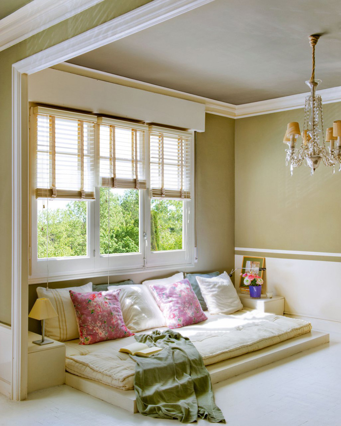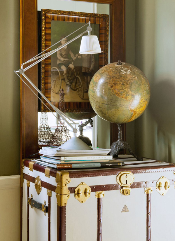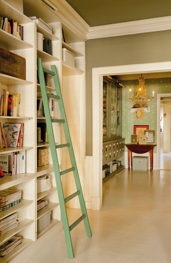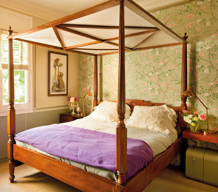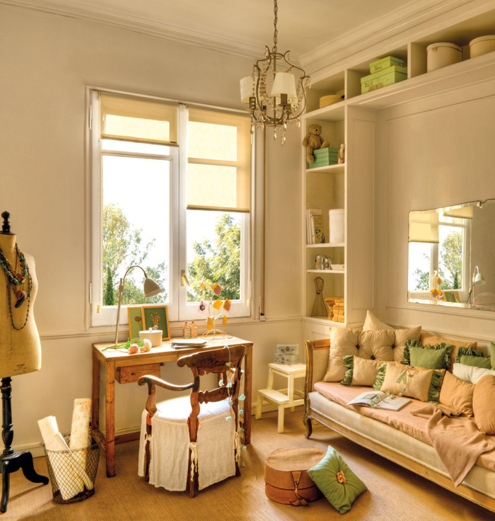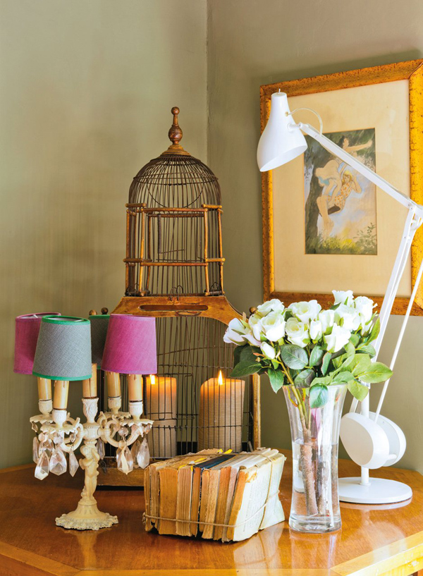 Удивительно, что мебель разная по внешнему виду гармонично сочетается: встречается и обработанное лакированное дерево — столы в гостиной, просто сказочная кровать с балдахином в спальне; не обработанное – столик и стул в мастерской хозяйки; и крашеное – оливкового цвета сервант; вполне современные белые стеллажи с книжками в зоне отдыха. Это же можно сказать и об осветительных приборах — от классических люстр до медных настольных ламп – все столь разные в своем многообразии, но не нарушают общий дух интерьера.