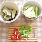 Баклажан порезать тонко (кусочки длиной 5-7 см), присолить и оставить на минут 15, чтобы выделился сок. Кабачок тонко порезать, как и баклажан.