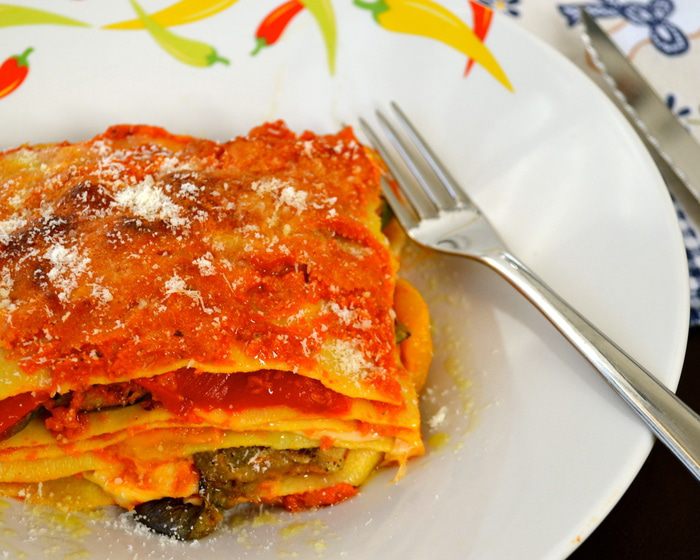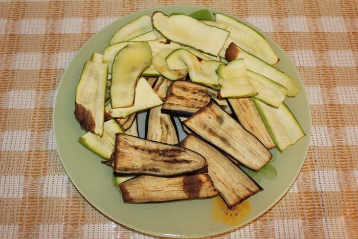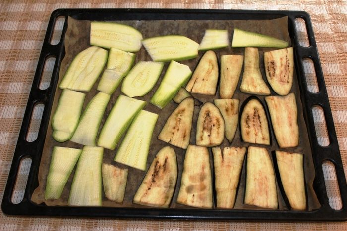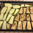 Разогреть духовку до 180 градусов. Противень застелить пергаментом и выложить кусочки баклажана и кабачка. Запекать минут 15.