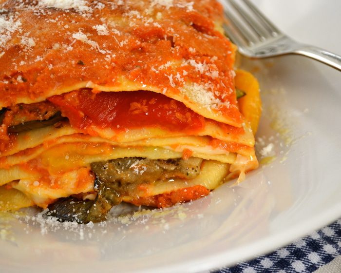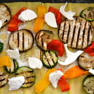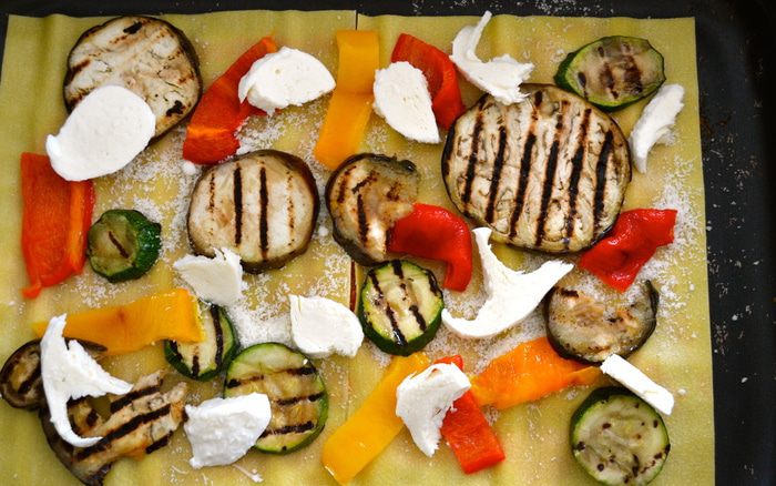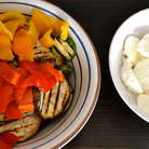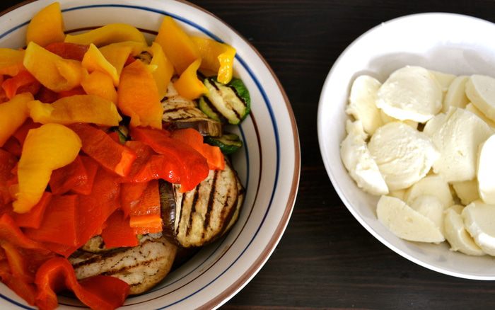 Баклажан и кабачки нарезать кружочками по 5 мм, сбрызнуть оливковым масло, немного посолить и поперчить и обжарить на сковороде гриль партиями. Сложить все подготовленные овощи в одну миску.