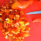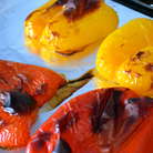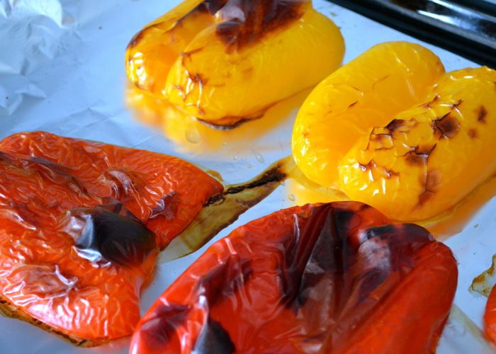 Тем временем займемся приготовлением овощей. Духовку включить в функции гриль, или только верхний прогрев. Сладкие перцы вымыть, разрезать пополам. Застелить противень фольгой, сбрызнуть маслом и выложить половинки перцев срезом вниз. Запечь перцы под грилем 10-15 минут, пока кожица на перцах не зажариться до состояния, близкого к подгоранию... ))) В общем, как на фото! ))) Дать перцам немного остыть, а затем удалить семена и снять кожицу... Нарезать полосками.