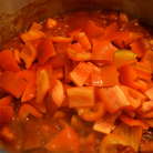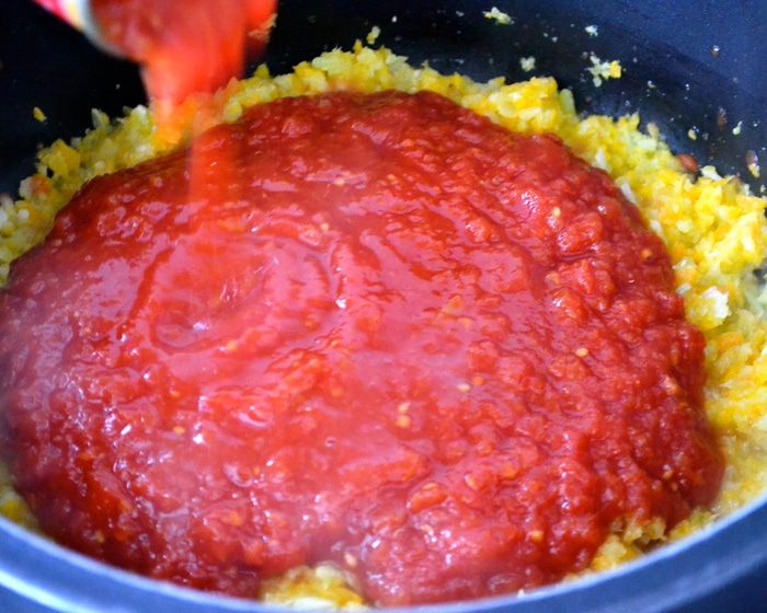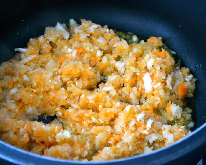 Первым делом займемся приготовлением томатного соуса. Я все необходимые для соуса овощи изрубила достаточно мелко (но не в кашицу) с помощью миксера. В глубокой сковороде разогреть оливковое масло. Положить овощи, тимьян, немного соли и, регулярно помешивая, обжаривать овощную смесь минут 6-8, пока овощи не станут мягкими.