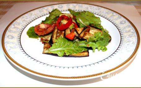 Листья салата выложить в тарелку, на них выложить баклажан и кабачок, помидор, порезанный крупно, сверху добавить заправку и сбрызнуть все оливковым маслом (0,5 ст.л.). Перед подачей салат хорошо перемешать. Приятного аппетита!;-)