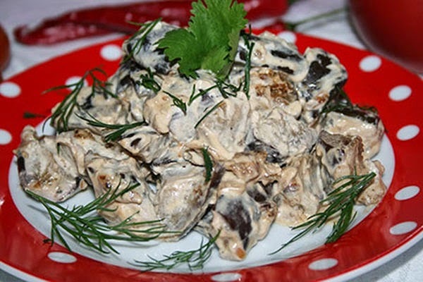 Для заправки смешиваем майонез со сметаной 1:1 (можно и без майонеза, кто не любит), добавляем мелко порезанные чеснок и зелень, можно специи.