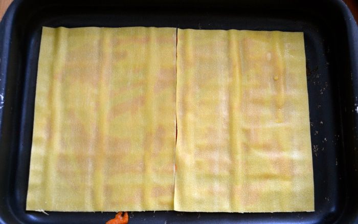 Духовку включаем на 180 С. Переходим к сборке лазаньи. На дно прямоугольной формы с высокими бортами кладем немного томатного соуса, сверху выкладываем 2 листа лазаньи (у меня форма на два листа)...