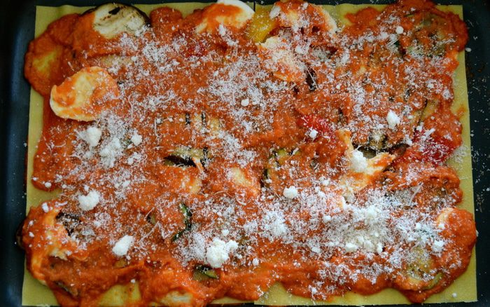Покрываем все слоем томатного соуса и присыпаем еще немного тертым сыром.
