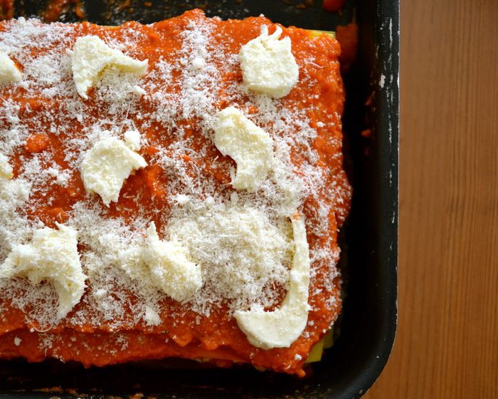 Повторить все в том же порядке до окончания всех ингредиентов... Последним слоем кладем листья лазаньи, покрываем их обильным слоем томатного соуса, выкладываем кусочки моцареллы и присыпаем тертым сыром. Запекать лазанью в духовке 30-40 минут...