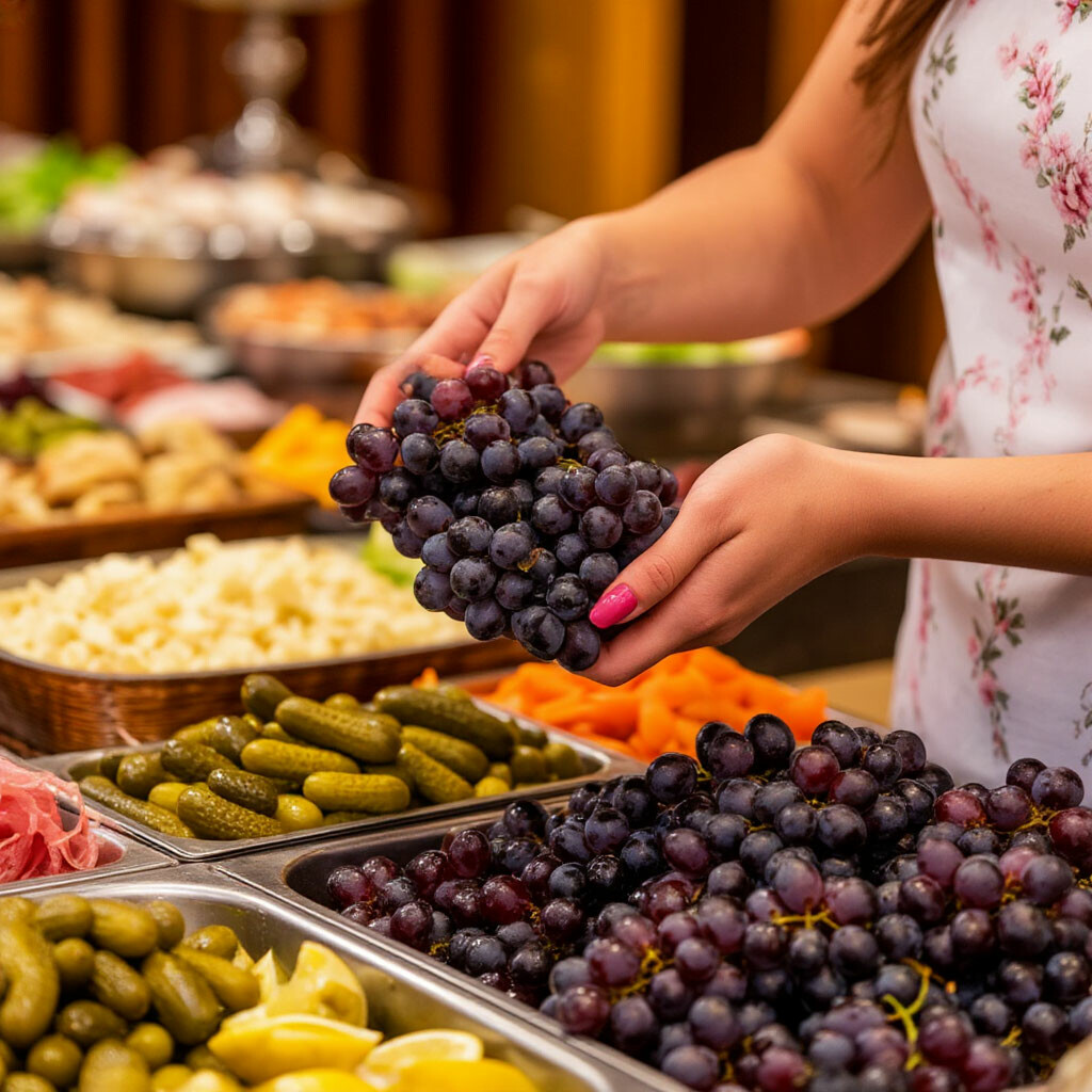 Шведский стол. Девочка лет 12 приносит на стол огурцы и тёмный виноград и солёные огурцы.