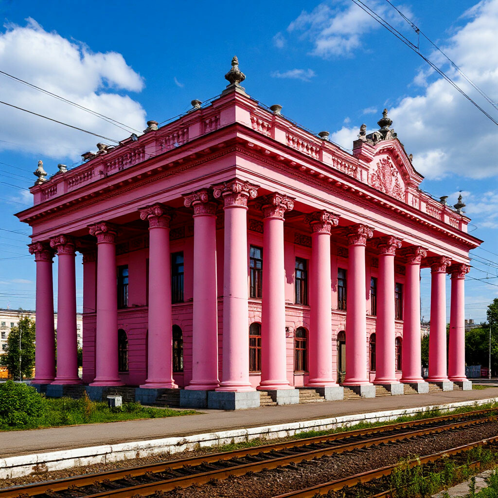 Вокзал небольшой, двухэтажный с помпезными колоннами. Привокзальная площадь с универмагом.