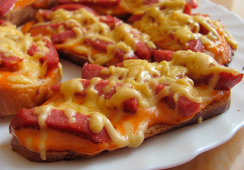 Это супер-экспресс-рецепт, на случай, если гости нагрянули внезапно и требуют пиццу и пивка, а у вас нет ни того-ни другого. Пока гости бегают себе за пивком, делаем быстренько горячие бутерброды, духовку ставим на полную мощь, желательно в режим "гриль".