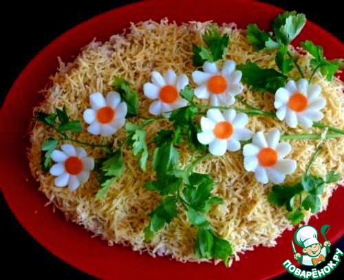 Уложить сверху начинку: тертый сыр, тертая сырая морковка, чеснок и майонез