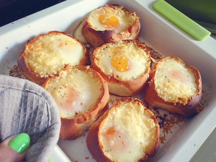 Мягкое сливочное масло нужно растереть с желтками. Затем этим маслом необходимо смазать тосты.