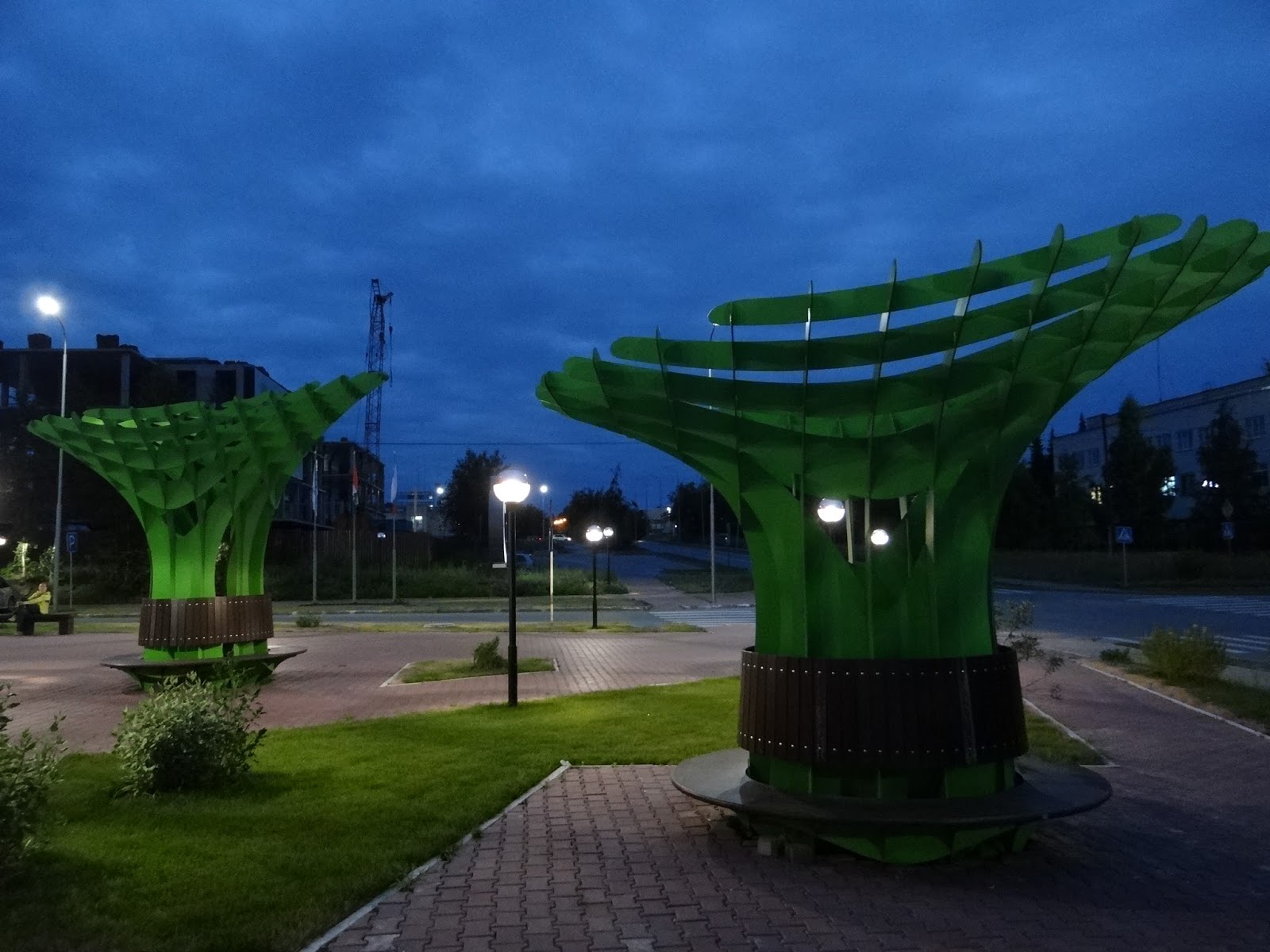 Рядом с левой башней (улица Николаева 11) и расположился седьмой по счету проект Арт-лавочек - Скамейки-деревья (координаты 54°51′28.38″N 83°6′36.22″E).