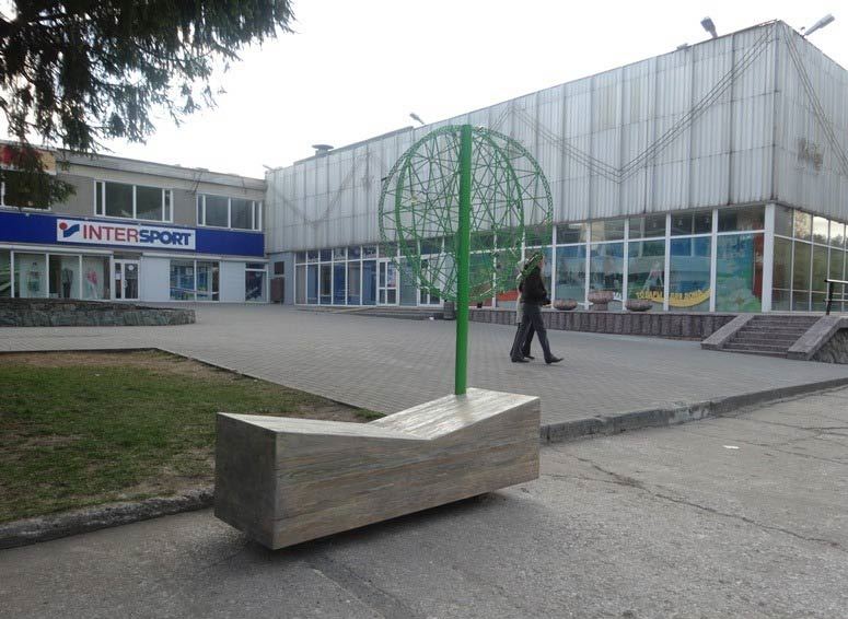 Со стороны улицы Золотодолинской находится помост с арт-лавочками пеньками.