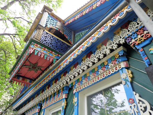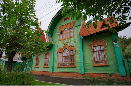 Дом украшен резной колоннадой и декором — растительным орнаментом и другими деталями.