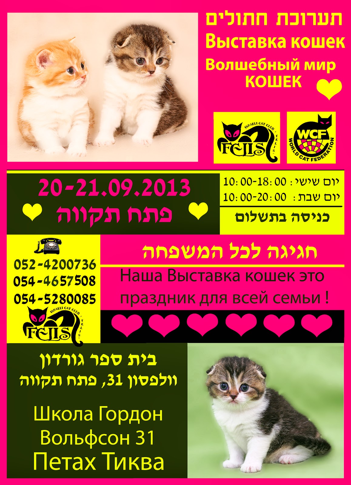 Кого можно увидеть и погладить на этой выставке, котенка какой породы захотят увидеть своим другом ваши дети? Может быть голубого или белого британского котенка, или котенка той же породы но редкого золотого или мраморного окраса, пушистого персидского котенка или вислоухого хайленд-фолда? Потомков величественных мейнкунов из лесов Америки или горячего, похожего на марсианина и приятного на ощупь голого котенка сфинкса? Коты, кошки и котята почти всех пород имеющихся в Израиле будут представлены на этой выставке. Вы сможете поговорить с заводчиками, людьми которые занимаются профессиональным разведением кошек и они приоткроют вам дверцу, ведущую в волшебный мир фелинологии - науки о кошках. Приходите к нам на выставку. Вполне возможно, что ваш самый ласковый и самый нежный зверь уже ждет вас. Все это вы можете сделать на выставке кошек, которая состоится в пятницу и субботу, 20 - 21 сентября, с 10 часов утра, в Петах-Тикве.