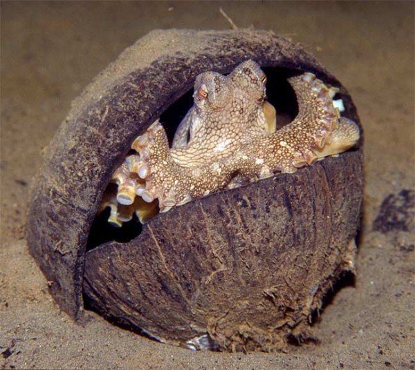 Осьминог короткорукий использует скорлупу кокосового ореха, чтобы соорудить себе мобильный домик. Когда ему захочется попутешествовать, он складывает скорлупу в стопку, как тарелки, захватывает их своими щупальцами и отправляется в путь по океанскому дну.