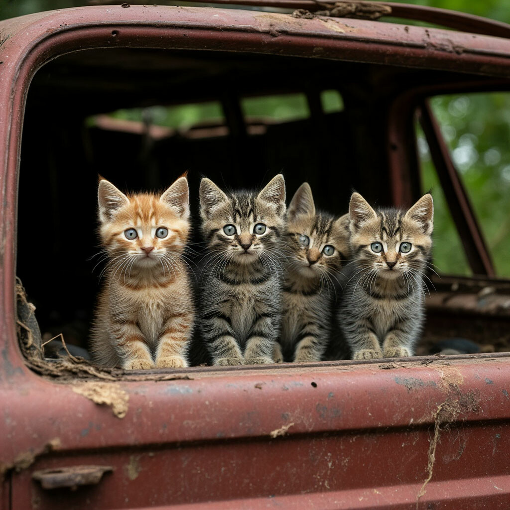 Грузовик торчит из пруда. В полузатонувшем грузовике поселились котята