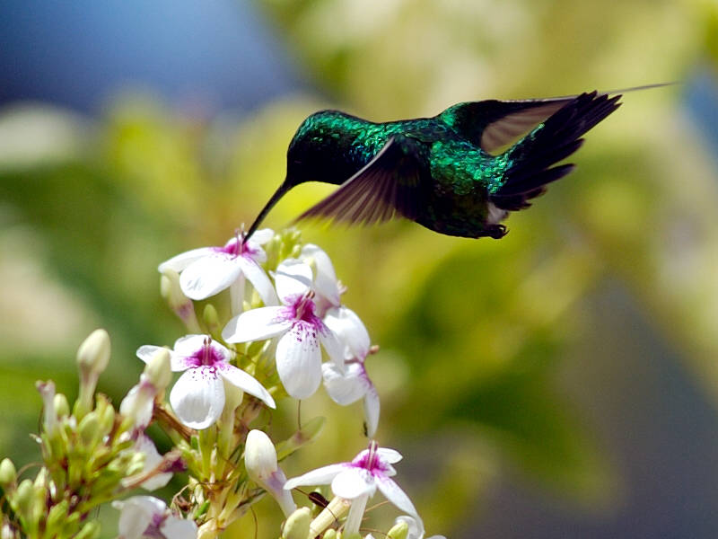 Для поддержания активной жизни, колибри нуждается в чрезвычайно эффективном “топливе”, которое она получает в виде нектара из цветов. Она подлетает к цветку, чтобы проникнуть в него клювом, неподвижно зависает в воздухе, пока не соберёт достаточно нектара, а затем отлетает назад.
