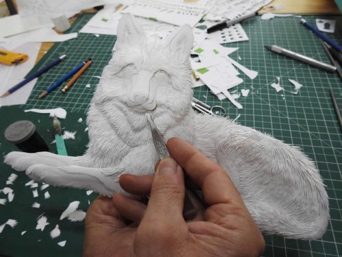 Когда вода испаряется, бумажный слепок подвергают тонкой и кропотливой работе – супруги добавляют или удаляют ненужные элементы, вырезают мельчайшие детали скульптур, что само по себе требует большой выдержки и нескольких месяцев работы.