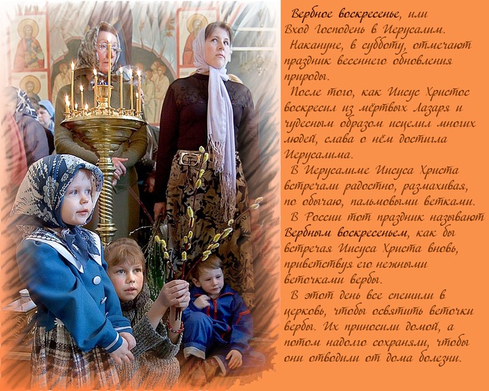 В этот Иисус въехал в ворота Иерусалима на осле, а народ приветствовал его, помахивая пальмовыми ветвями. Когда праздник стал отмечаться на Руси (примерно в 10 веке), пальм, ясно, не было, да и распустившихся листьев тоже. Потому выбрали иву, ракиту, вербу, на которых уже набухали почки. Да и сама по себе верба считалась деревом целебным. После освящения в церкви вербой старались коснуться друзей и близких с пожеланиями здоровья. Родители стегали ею детей, чтобы те росли здоровыми. У изголовья больного человека ставили веточки освященной вербы, чтобы она придавала ему силы и защищала от нечистой силы.