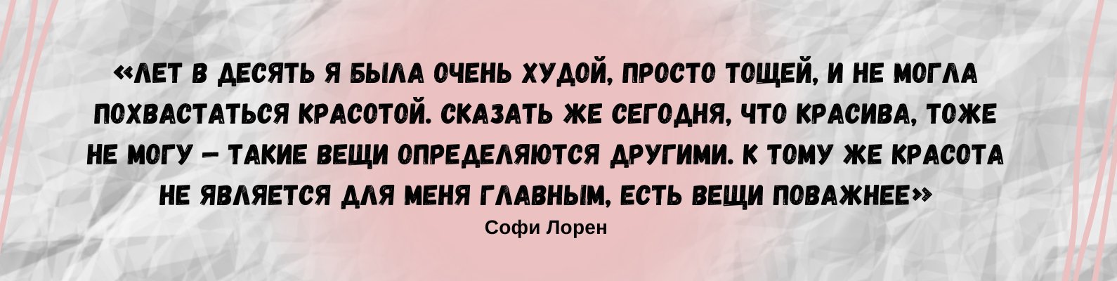 Софи Лорен еще одна из героинь , связанная с моими детскими воспоминаниями . В том же альбоме , где была фотография Одри Хепберн находилось и фото Софи Лорен . Женственные формы , огромные глаза , осиная талия , пышная грудь и львиная грива на голове , это все была она и спутать с кем- либо ее было невозможно .