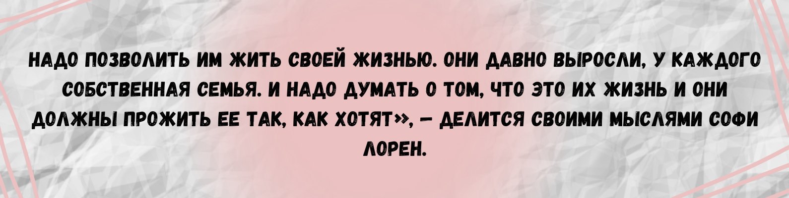 Ее друзья говорят, что философия жизни Софи заключается в работе и спагетти на ужин ). Она угощает своих близких так , как будто дарит им частицу своего сердца . А она считает , что никакие награды и почести не могут сравниться с чувством материнства и пониманием того , что у тебя есть семья , которой ты нужен . Жизнь и стиль Софи Лорен стали для многих примером того как можно быть успешной женщиной и при этом оставаться прекрасной матерью и женой .