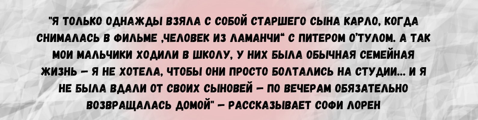 Эталон чувственности , звезда страсти , героиня брака , храбрая мать , Софи вобрала в себя все то , кем она хотела стать . На съемочной площадке в ее присутствии складывается очень домашняя и дружелюбная атмосфера . Софи играет роль матери , а все остальные окружены ее заботой и вниманием . Каждый становится членом ее семьи. Девочка из маленького рыбацкого городка Поццуоли добилась всего о чем мечтала с самого детства .