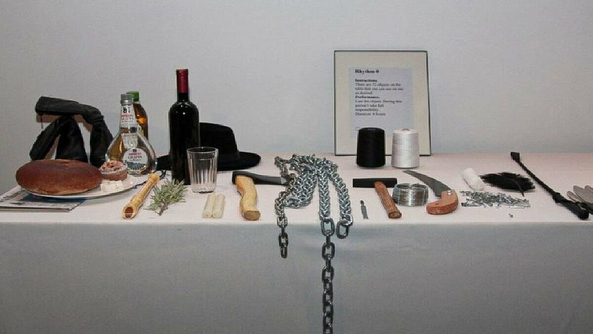 Причем, рядом на столе были разложены 72 предмета, которые они могли при этом использовать. Некоторые из них доставляли удовольствие, некоторые — боль, а некоторые могли привести к смерти. Примеры разложенных предметов - мыло, вино, хлеб, соль, виноград, спирт, ложка, спички, гвозди, перья и многое другое, включая заряженный пистолет. А рядом лежала инструкция, на которой было написано, что с 20.00 по 2.00 с сидящей в комнате Мариной можно делать что угодно и она сейчас — просто объект. Такие вот вроде бы простые условия, но результат потряс и зрителей, и саму художницу.