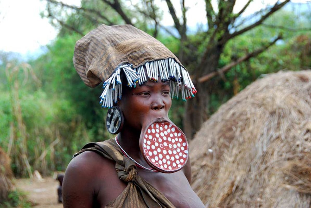 Мурси.Отличительной чертой Мурси является глиняное блюдце в нижней губе у женщин. Считается, что уродовать они себя стали, чтобы колонизаторы не забирали их в качестве рабов. Даже когда работорговцы прекратили свои набеги, это "украшение" осталось и красота женщины оценивается по размеру вставленного блюдца. Стоить такая невеста будет дороже чем безгубая в несколько раз.