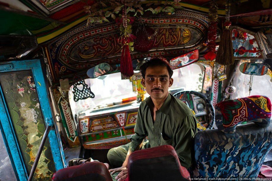 Глядя на пакистанские грузовики и автобусы, поражаешься не только красоте, яркости и полету фантазии, но и тому, как сотни привинченных, привязанных, подвешенных и прилепленных деталей держатся на своих местах и еще остаются при этом чистыми и нарядными. А еще возникает вопрос безопасности. Как из роскошной мягкой кабины, превращенной в какой-то средневековый будуар, можно безопасно следить за дорогой? Но ведь как-то же следят и небольшое количество аварий на пакистанских трассах яркое тому подтверждение.