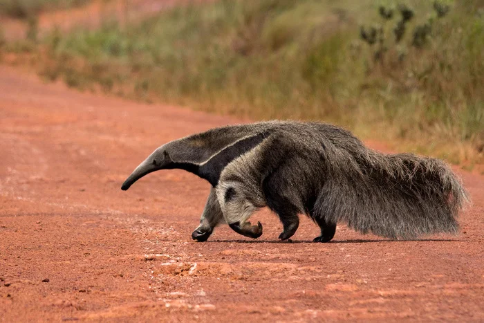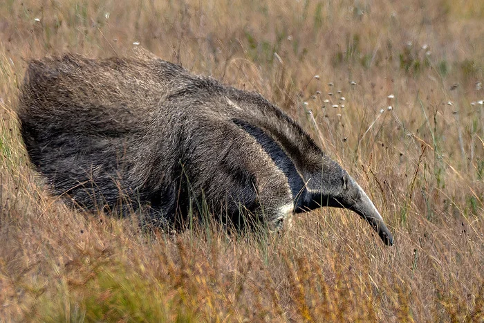 Конечно, вы все узнали гигантского муравьеда (Myrmecophaga tridactyla) – самого крупного представителя отряда неполнозубых. Он, действительно, оправдывает своё название, достигая длины два метра тридцать сантиметров, правда, примерно метр приходится на его роскошный хвост.